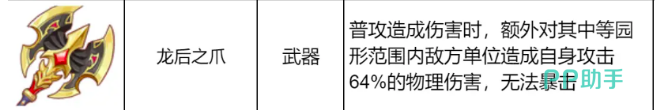 龙后之爪也是非常强力的武器,亚瑟王拿着它的时候,普通攻击除了正常伤害,还会对周围的敌人,造成额外的范围物理伤害,伤害值是自身攻击力的64%。虽然这个额外伤害不能暴击,但是打群怪的时候清理速度会快很多,推图效率直接翻倍。