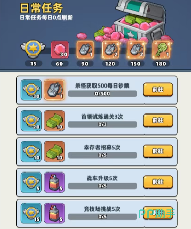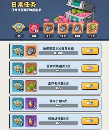 首先为大家推荐的第一个必做就是日常了,日常相信是很多玩家每天进入游戏第一个会选择做的任务,在其中大家只要打满自己的活跃度就可以完成所有的日常,基础是可以拿到180的活跃度奖励,那么在其中可以拿到大量的钻石,因为钻石在其中作为最重要的一个货币,那么在其中购买的大部分使用礼包都是需要用钻石购买的,而且在这种士兵识别牌是非常重要的一个道具,因为幸存者如果要进行突破的话,消耗的这个识别牌数量是非常多的,另外就是角斗凭证,后期解锁竞技场之后进入的话,在其中需要消耗这个挑战券才可以玩到足够的场次,而在角斗凭证里面大家可以消耗掉的数量越多,那么后期每天可以拿到的竞技场奖励也就更多一些,另外就是罐头密钥这个道具,后期的大家解锁了罐头副本的话,进入其中也是需要消耗这个挑战键才能够进行比拼的。
