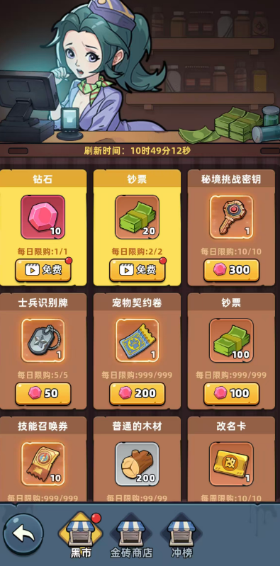 另外如果解锁了实验塔的话,建议大家每天要把其中的限定次数都用完,因为实验塔里面获取到的各种罐头以及钞票前期消耗比较大,此时达到一定层数挑战的话,在试验塔里面大家还可以额外获取更多的首通罐头奖励,另外在黑市里面,大家每天可以去买一定的士兵识别牌,因为当前需要士兵识别牌就是根据自己角色培养的数量来进行提升,想要培养的角色越多的时候,士兵识别牌消耗的就越多,所以在黑市里面每天购买士兵识别牌还有限定次数的时候,每天的次数都买满会让大家节省更多的获取时间。