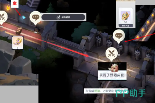 离开密室之后继续往右边走,这场战斗的关键就是获得野猪头套,后续通关全部都靠他。记住这一个头套的正确用法,点击屏幕右下角的按钮切换形态,变成猪之后就可以经过狭窄的路段。但野猪没有办法战斗,在遇到敌人之前,别忘记要切换人形,否则就会直接卡住。拿到头套之后,就可以看到墙上有一个气泡机关,可以先处理眼前的路径,先不管。在下方区域先把左侧的第3个宝箱拿起来,然后进入到右侧房间,可以获得蓝色解锁道具。