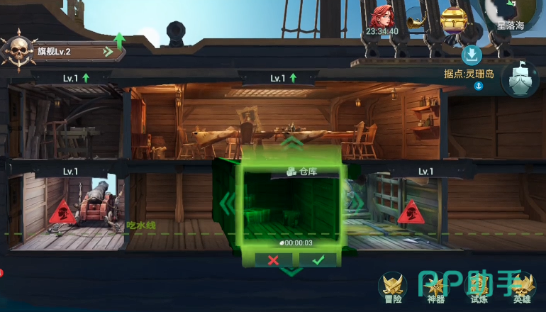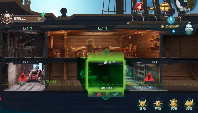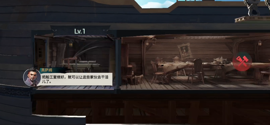 除了战斗玩法游戏还有提供建造、贸易以及各种探索玩法,这些玩法里面也是可以拿到更多启动资源的,包括基础的船员,大家拿到之后可以安放在船只里面进行海外探险,在这里核心玩法当中船舱建设是一定要注意的重点,因为在船舱当中所有的东西都是要大家用作海上发展的,而且优先升级的话,也可以让大家建造的船舱效果更高级一些,那么在这里船舱里面不同的场景,提供的能力是不一样的,比如说船长室,如果大家觉得自己的指挥能力比较低的话,优先选择船长室来进行建造,这样的话,在前期就可以提升不同角色的指挥能力,提升到战舰的整体属性效果,之后会让这个船舱的能力更强势。