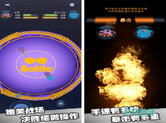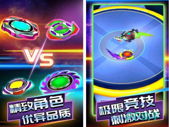 不仅可以通过双人匹配的方式加入到陀螺对战当中,还要使用释放技能以及灵活走位的方式,才能够在决斗场当中战胜对手。里面的每一个陀螺都有着超级炫酷的颜值,你需要在玩的时候控制着属于自己的陀螺,利用所具备的技能对敌人造成伤害,还要有效躲避敌人的攻击。需要注意的就是陀螺越强,伤害力越高,要注重技能释放。