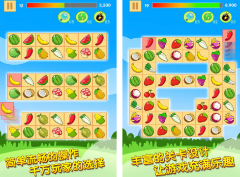 非常经典的连连看手游,除了让大家在经典的模式当中畅玩,还可挑战一下自己的速度,总之,它的模式非常的丰富,会让大家挑战的时候看到各种类型的水果甚至是蔬菜。利用简单的操作方法,点击完全相同的两个图片,这样就可以完成挑战的任务。不断的闯关,重温很多经典的内容,每次挑战都会有不一样的体验。
