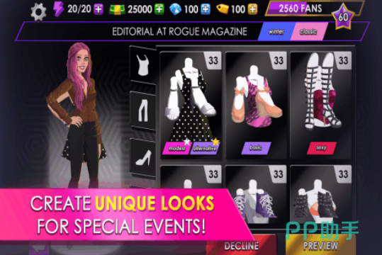 换装以及三消玩法为核心,大家将会进军为时尚的行业中,可以为其中的顾客制定出相应的妆容,或者是从不同的服装中正确搭配,满足更更多客户的需求即可参与比赛。包括的主题内容也特别多,比如有高雅晚宴或者是街头潮流等等,可以按照这些主题随意搭配出不同的服饰,还支持对战pk模式,增加了互动性。