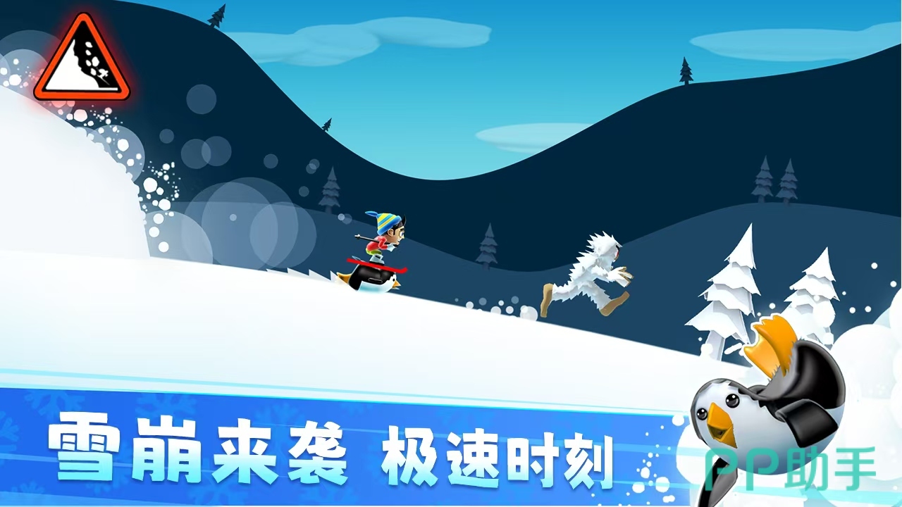 本作是移动平台早期跑酷机制的重要实践者之一。玩家操控滑雪者沿陡峭雪道高速滑行,依靠点击屏幕完成腾跃动作,规避雪松、冰窟、滚石等环境障碍。部分大型障碍需配合空中旋转时机落地,对反应速度与节奏把控提出更高要求。美术采用低多边形建模结合高对比度配色,在性能受限的设备上仍保持画面流畅与视觉识别度,展现出扎实的工程优化能力。