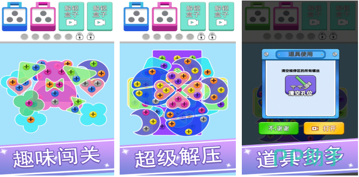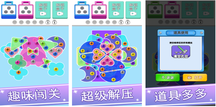 这是款与打螺丝元素相关的趣味闯关类小游戏,气氛塑造极为解压跟操作概念新鲜感不俗,大家要尝试拧下一个个螺丝让金属板脱离,这样的解谜休闲设定提供的代入感更强,还设定了很多专业的道具辅助大家快速拆开螺丝,游戏关卡多样还会随机刷新高难度模式,金属的碰撞音效跟螺丝主题的设定也是交相呼应,这款极度解压的休闲打螺丝神作你也试试吧。