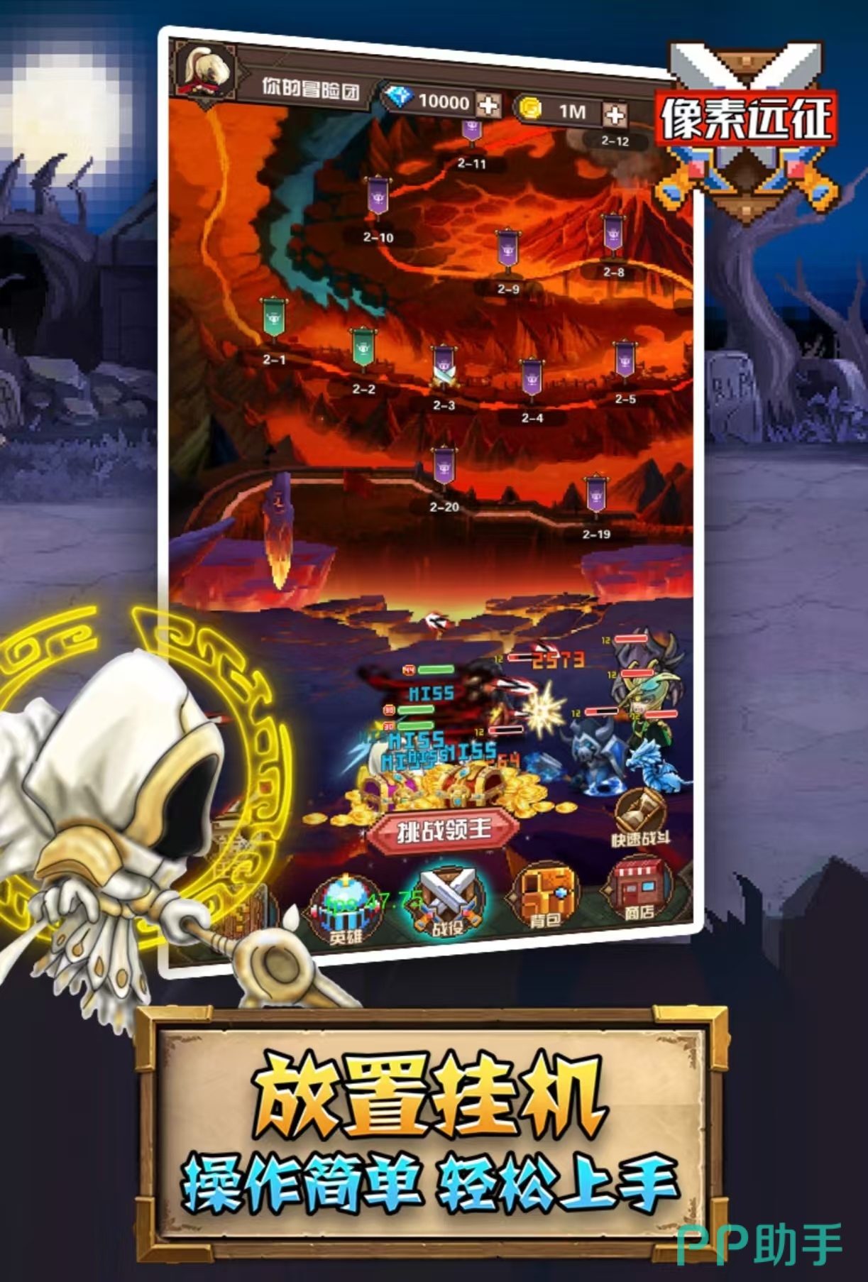 《像素远征》提供了一个复古的像素风格世界,通过招募角色的方式组建一支战队,每个阵营的选手有不同的造型和能力,可以建成千变万化的阵营。通过挂机的方式可以实现自动战斗,并且还可以自动的收集资源,每天上线还有很多的钻石奖励,每次击败boss可以获得很多传奇的装备。也需要不断的合成更多强大的武器,能够感受到很多丰富的章节和副本。