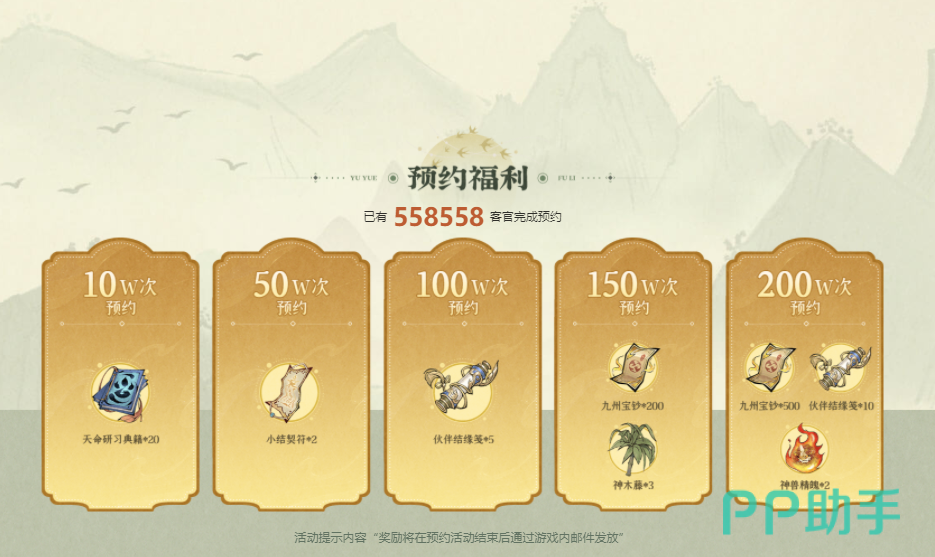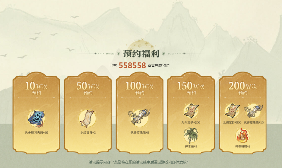 当前预约人数已突破50万。届时所有预约玩家将额外获赠天命研习典籍×20、小结契符×2。当总预约量达100万时,全服玩家可再领取伙伴结缘筏×5;预约达150万,除追加200个九州宝钞外,还将解锁神木藤×3;若预约人数成功突破200万,除前述全部奖励外,还将额外奉上500个九州宝钞、伙伴结缘筏×10、神兽精魄×2,助力玩家开局即拥有多维成长优势。