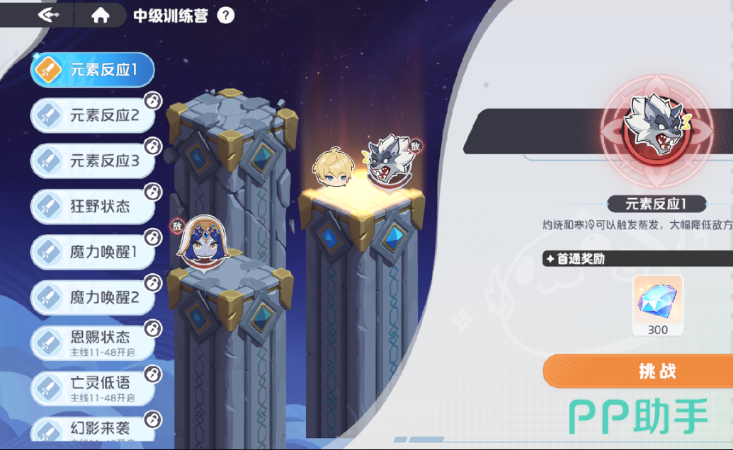中级训练共设9个关卡。首关关键在于站位与元素协同:必须将领主置于阵型中央,以规避狼人对后排的突进威胁;同时合理衔接小火龙的技能与领主的冰属性技能,触发“蒸发”反应——该效果不仅造成额外伤害,更可显著降低敌方命中率,大幅提升生存容错。