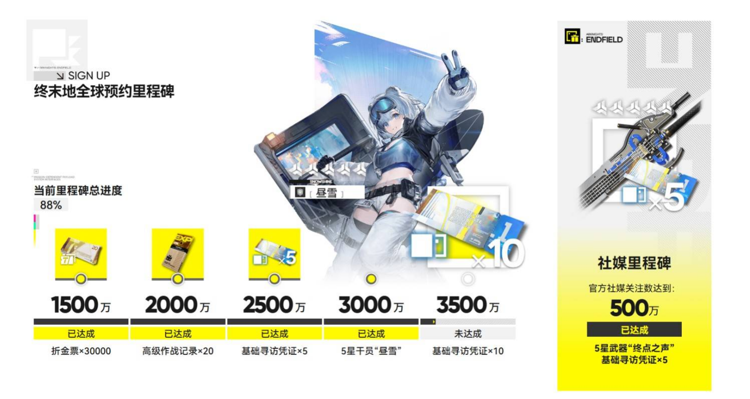 最高档位是3500万人,达成之后再给10张基础寻访凭证。加上前面2500万人给的那5张,总共就有15张了,差不多能进行一次小保底。除了预约人数的奖励,官方社交媒体关注数达到500万还有额外福利,可以拿到五星武器终点之声和5张基础寻访凭证。这把武器虽然不知道具体属性如何,但既然是预约奖励应该不会太差,前期过渡肯定够用。