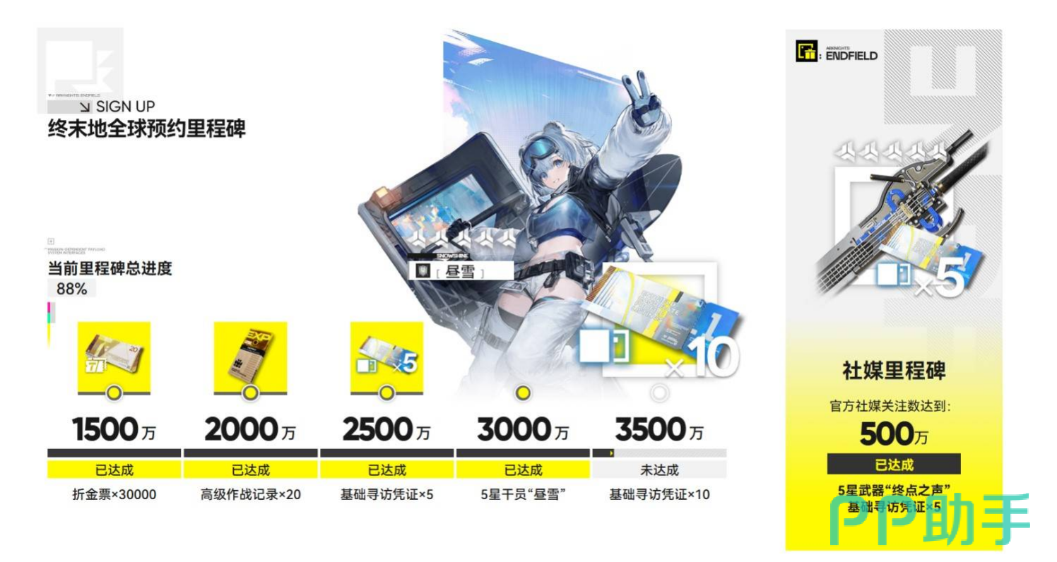 再往上2500万人的时候,会给5张基础寻访凭证,也就是抽卡券。虽然数量不算特别多,但聊胜于无,说不定就出货了。到3000万人这个节点就比较关键了,因为会直接送一个五星干员昼雪。这个干员在游戏里表现还不错,对于零氪或者微氪玩家来说,白送的五星干员肯定不能错过,能省下不少资源去抽别的角色。