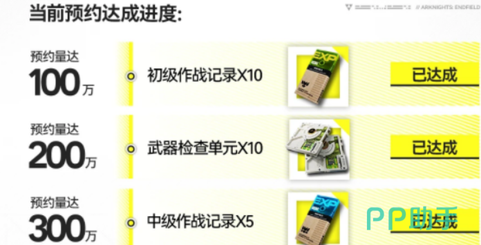 预约人数是分档位的,每达到一个档位就能解锁对应的奖励。第一档是1500万人,可以领到3000折金票,这个数量说实话还算可以,前期抽卡或者买点小东西都够用。等人数到了2000万,就能拿20个高级作战记录,这个对练级有帮助,新干员拿到手能快速提升等级。