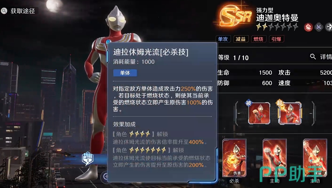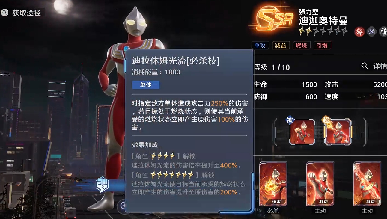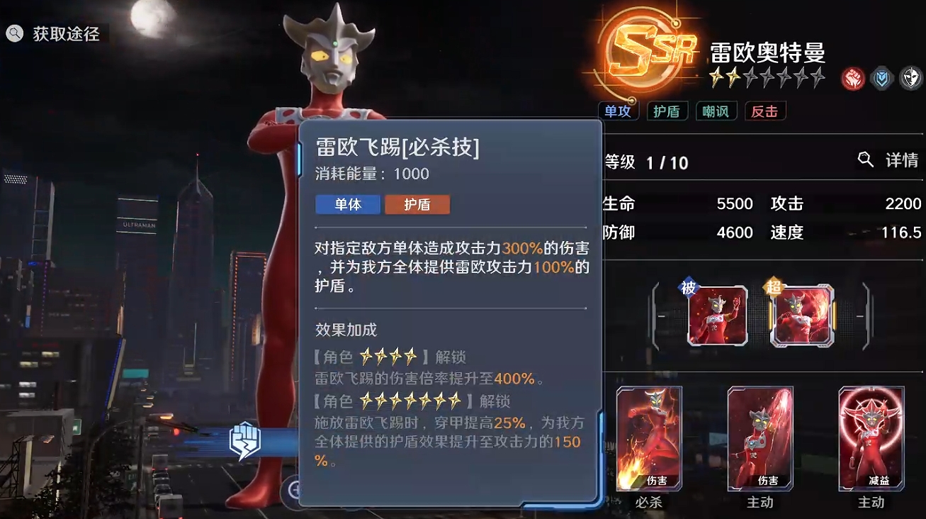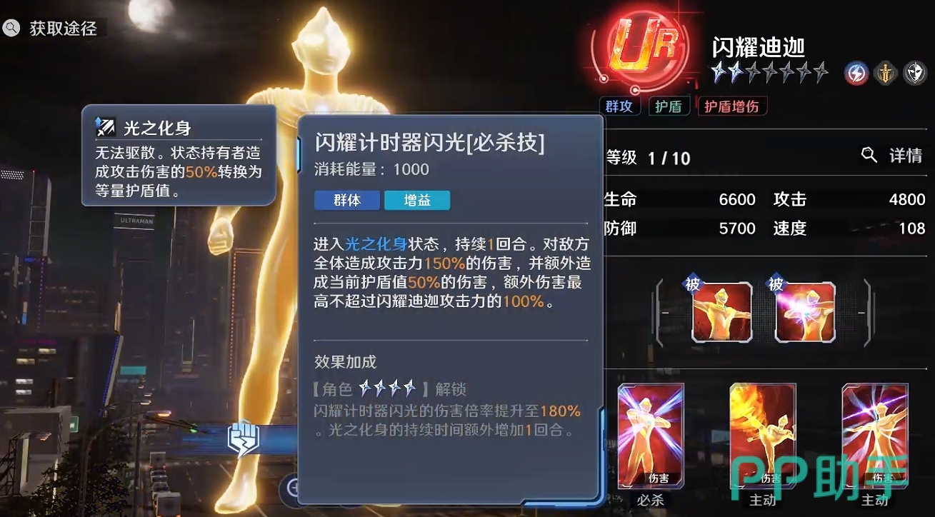 其必杀技可使自身进入「光之战士」状态,持续一回合,并对敌方全体施加基础伤害。伤害结算时,将依据当前护盾值额外追加一段伤害,该追加伤害上限为闪耀迪迦攻击力的100%。由于护盾类辅助角色普遍具备稳定提供高额护盾的能力,该机制在实战中极易突破理论上限,形成可观的复合爆发输出。