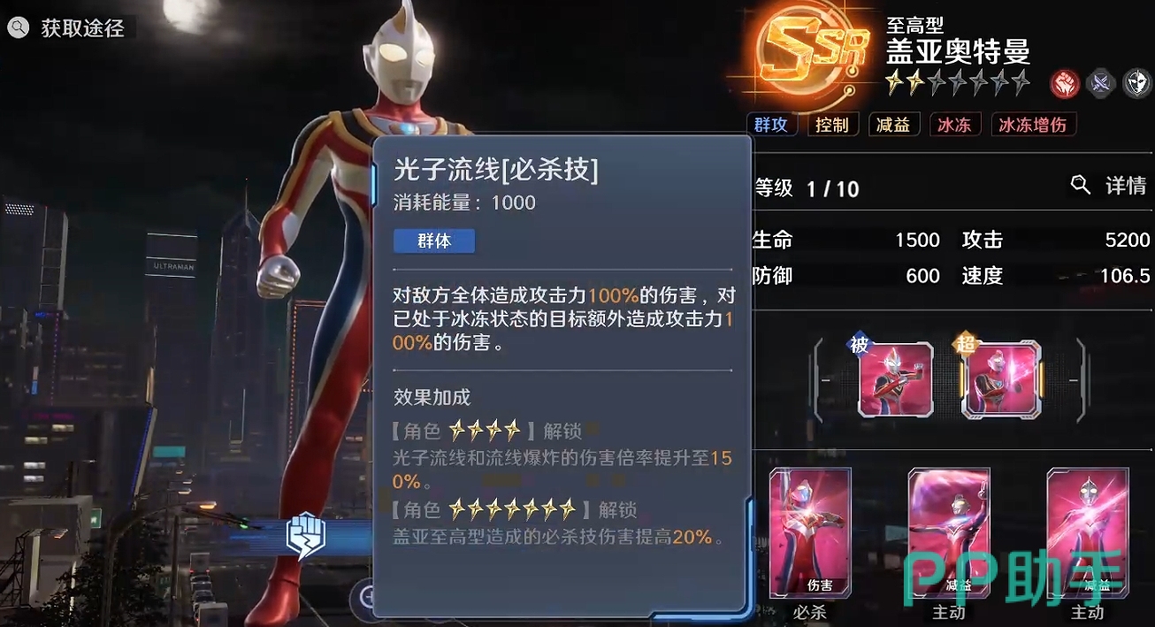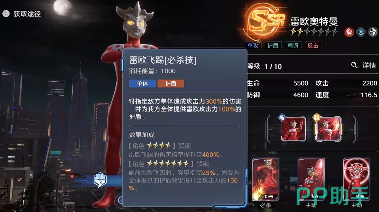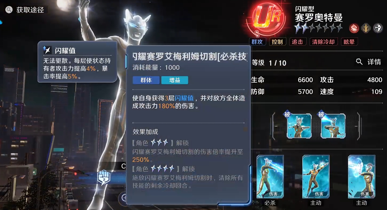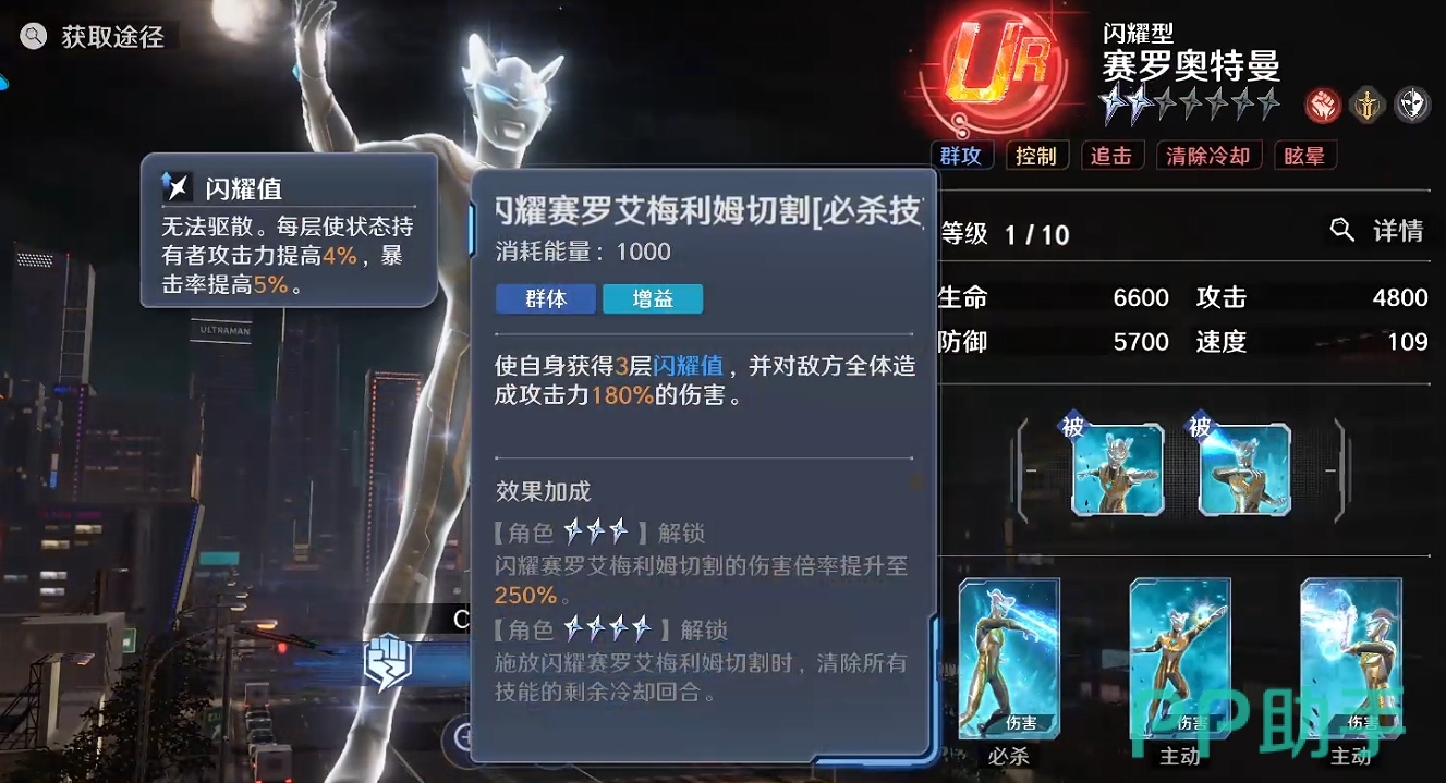 其必杀技可使自身进入「光之战士」状态,持续一回合,并对敌方全体施加基础伤害。伤害结算时,将依据当前护盾值额外追加一段伤害,该追加伤害上限为闪耀迪迦攻击力的100%。由于护盾类辅助角色普遍具备稳定提供高额护盾的能力,该机制在实战中极易突破理论上限,形成可观的复合爆发输出。