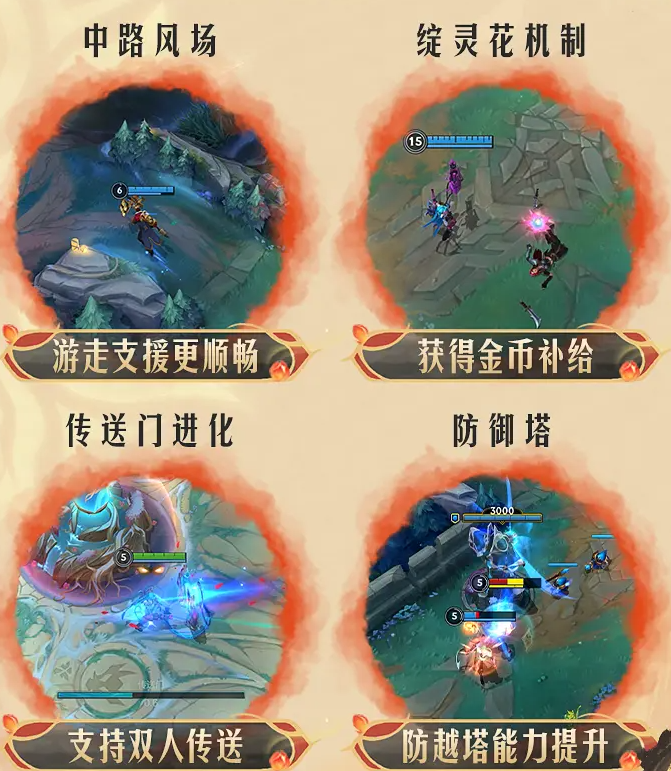 机制层面迎来多项回归与革新:远古巨龙与峡谷先锋的增益效果正式重返战场;中路新增动态风场区域,英雄穿越时将获得持续移速加成,显著提升游走效率与突袭响应速度;地图新增绽灵花交互点,攻击后可获取额外金币收益;传送门功能升级为双人协同传送,强化上单与打野联动、下路组合战略转场能力;防御塔基础属性全面上调——包括生命值、攻击力及攻击速度,前中期越塔行为风险明显提高,对线压制力与塔防威慑力同步增强。