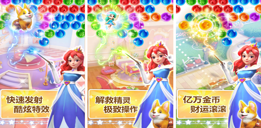 本作其实玩法也是泡泡龙主题的消除模式,可以快速发射小球球进行消除类的任务,整体的特效酷炫炸裂带来的视觉效果也很不错,可通过消除泡泡的方式解救可爱的小精灵,极致快速的操作机制让无数消除爱好者心驰神往,还设定了多人对战和金币场这些有趣的模式,小宠物会帮助大家一起参与泡泡龙消除任务,色彩明亮的背景呈现也让画面党心驰神往。