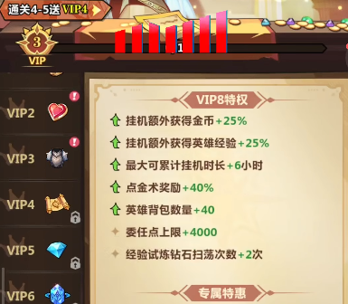 比如说其中如果选择的是金榜回血的话,那么带来的就是全场角色在续航和气血回复这上面带来35%的一个提升,所以在增强全队阵容里面生存效果的话,大家就可以选择这个金榜回血,另外对于法师暴击这类博益效果来说的话,提升的就是英雄在暴击上面的属性,一次性可以提升25%的数值,之后对于大家喜欢玩法师输出的玩家来说,给角色带来的提升也是非常鲜艳的,这里使用阵容核心来进行整体博益选择,也是可以给大家带来一些挑战的胜利概率,因为离线给大家累计到的资源奖励也有很多,所以前期经常上线领取的话,大家也可以将这里的道具用作英雄升级,那么游戏当中针对英雄升级以及各种培养途径来说的话,其实在养成路径上面还是非常明确的,比如在提升等级效果上面最高是可以达到千级以上的。