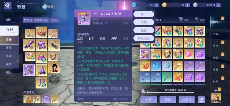在前期大家要玩战士一定要注意优先升级到40级的时候,才可以给他带来足够的技能强度,前期主要玩的是旋风斩这个技能,这个技能在等级没有超过35的时候是需要装备加成的,比如说拓荒的两件套或者是四件套都是可以放在这里进行搭配使用,这里给他搭配这个拓荒战士大剑的话,也可以给战士带来足够的附加能力,而且会有20%的吸血体现在旋风战技能效果上面,此时还可以对其中已经击中的目标带来足够的吸血效果,这里达到的吸血百分比也会有100%的数值,后期通过这样的一个战力让大家去打怪的话,大家还是优先去选择升龙路线比较好,主月光跟主升龙其实能力效果有很大区别,主升龙的话,那么在这里升龙斩的效果大家要注意,拉到45级左右就要搭配符文了。