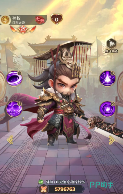孙权:虽然是基础无双角色,但是这个角色也有一定的概率可以升星到六星,不过前期技能效果只有最多五星的强度,他可以为己方生命比例最低的3个目标回复自身攻击134%的生命值,此时的孙权自身会获得1层暗能印记,这个印记的效果就是孙权受到伤害后,会消耗1层buff,并且为己方生命比例最低的目标回复50%攻击力的生命值,最大的这个回复是可以叠加5层的,而且有30%概率带来额外的庇护能力,之后带来的护盾也有8%的数值,一般是针对我方最弱的一个队友带来的回复,所以他的回复能力当中还包含有足够的防御数值可用。