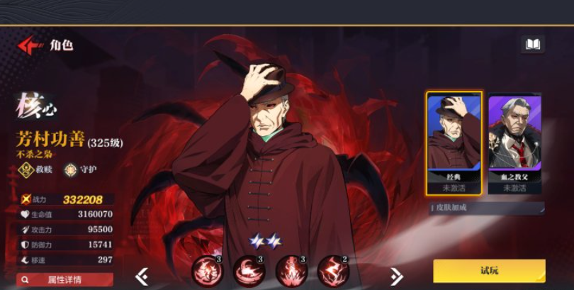 最后会带来推荐的就是芳村功善,他当前在队友需要支援的时候,能够带来的攻击形态会更多一些,而且此时他进行攻击的话,还可以带来40%的吸血提升能力,利用自己的普攻强化带来战机的时候,可以对范围之内的敌人造成150%的攻击能力,觉醒了之后他在相应形态下面可以提升自己50%的暴击概率,而且每次使用普攻在有状态加成的情况下还可以让敌人在半秒之内陷入眩晕的效果,那么此时他幻化成利爪来进行攻击的话,带来的物理伤害一次性都有200%的数值了,所以玩好这个角色的关键就在于赫者形态。
