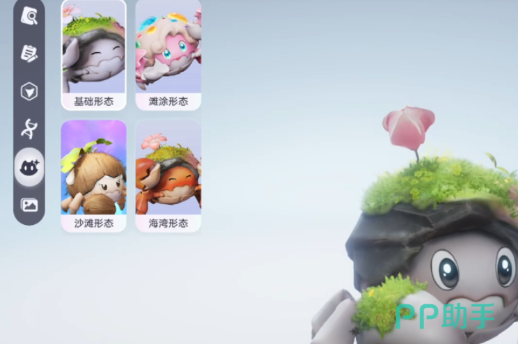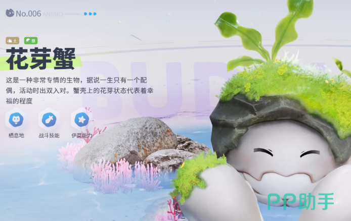 花芽蟹的基础形态共分三类,均由其栖息地决定:在湘花岸区域出现时,呈现为“滩涂形态”,体表带有湿润泥沙质感与浅褐色斑纹;于鲸落浅滩被发现时,则切换为“沙滩形态”,甲壳泛出微光,附着细小贝壳碎屑;若在欧明湾捕获,则表现为“海湾形态”,通体呈青灰渐变色,边缘略带海浪纹路。此外,该生物具备拟人化情感系统——当处于恋爱状态时,头顶会随机生成一朵动态小花,花朵开放程度与当前幸福值正相关,幸福度越高,花瓣越舒展、色泽越鲜亮。