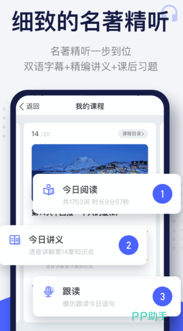 “每日听力”是它赖以生存的基础,而它的跟随能力,也是建立在强大的听觉生态上的。里面有大量的音频资料,可以作为学习的模板。它的特点是支持一种名为“影子跟读”的高级培训方式:使用者带上头戴式耳机,以近乎同步的速度(0.5-1秒)模拟耳机里的声音,如影随形地跟着。该程序为不同程度的学生提供了学习资料,并且可能会有同步的字幕。