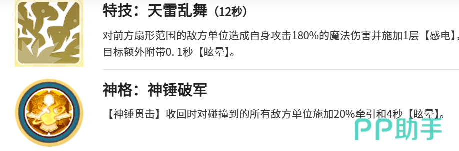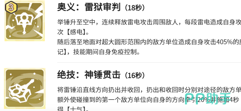 技能链设计强调节奏把控与战术衔接。“雷狱审判”作为关键团控技,拥有18秒冷却时间,释放后可连续发动多次雷电打击,每次造成49%魔法伤害,并对每个命中目标叠加最多3次感电效果;落地瞬间触发大范围重击,且全程享有免疫状态,确保在复杂战场环境下仍能稳定打出成吨输出。“神锤贯击”则承担先手开团职能,冷却时间为16秒,且可在战斗初始即刻启用。