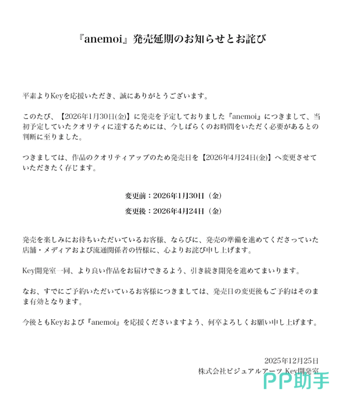尽管发售窗口有所延展,但《Anemoi》所承载的Key社式情感表达内核并未改变。2026年4月24日这一最终节点,既是对品质承诺的兑现,也是对玩家长久守候的回应。随着打磨周期延长,剧本细节、配音表现与系统交互有望进一步优化。期待这部以风为引、以约为名的作品,如期开启属于真澄町的温柔篇章。