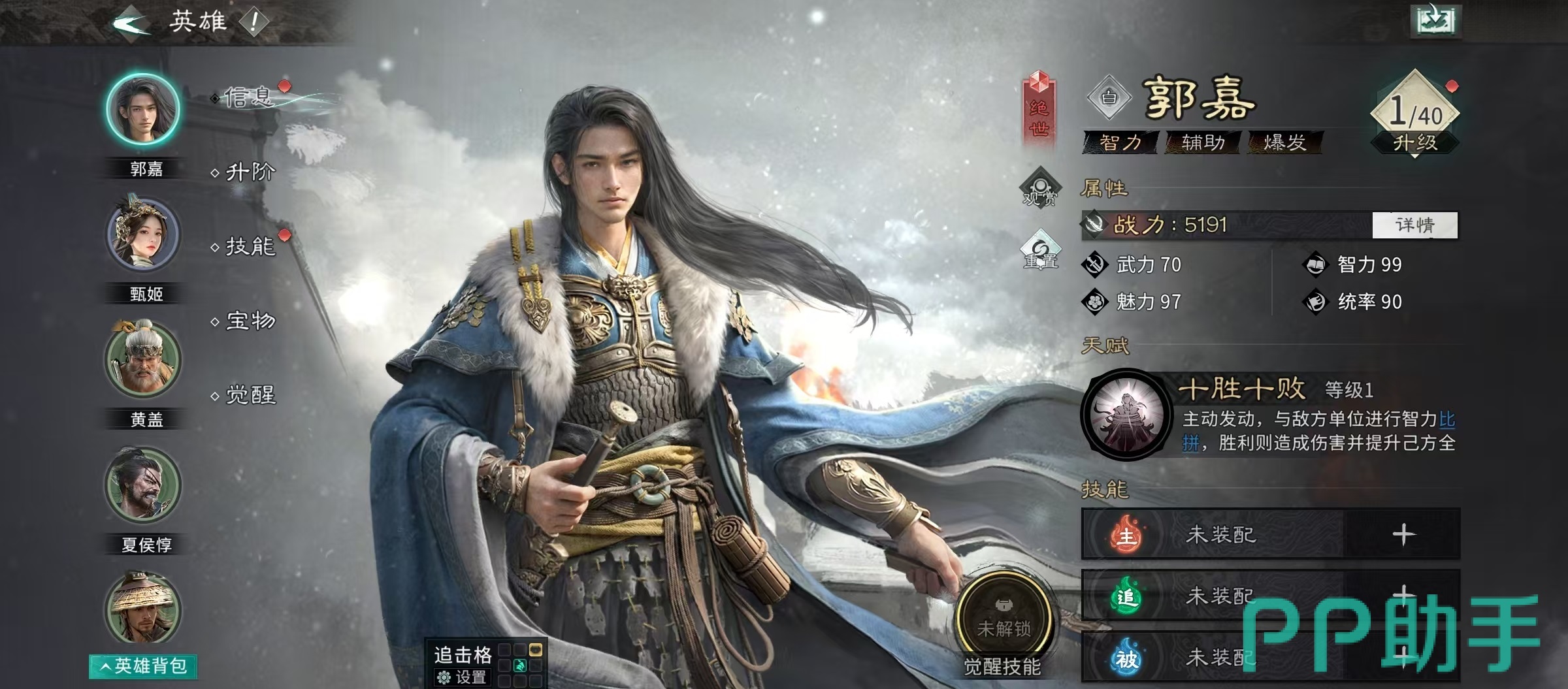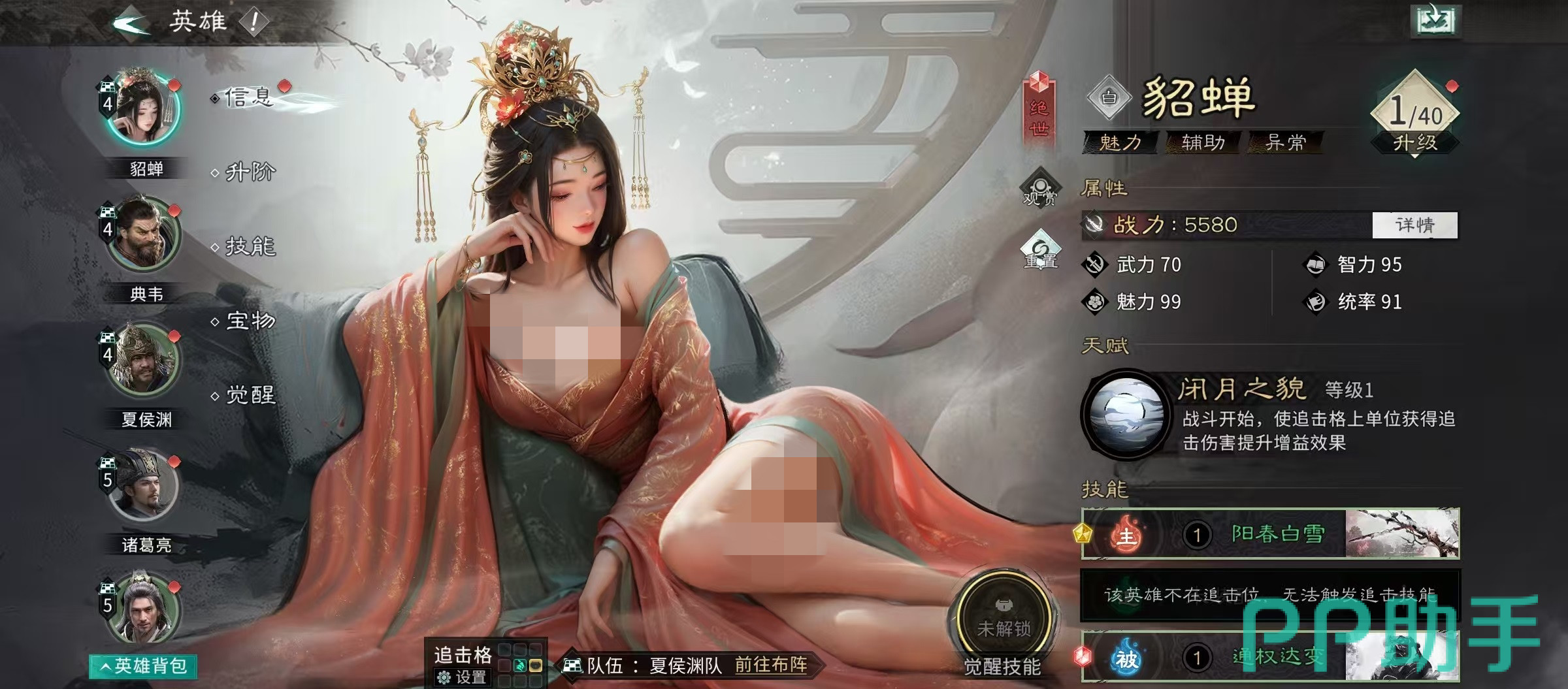 技能配置方面,许褚主选追击技【万军取首】,该技能具备高额单体伤害,并在兵力低于50%时触发额外伤害加成——契合许褚易损特性,实现高频增伤循环;被动技能首选【白虹贯日】,显著提升暴击率,配合暴击类宝物可达成稳定暴击输出。郭嘉主动技选用【兵无常势】,提升全队技能释放概率;追击技【临危不乱】增强残血反制能力;被动【运筹决胜】进一步优化技能联动效率。貂蝉主动技【通权达变】提供额外追击机会,被动【兵无常势】与郭嘉形成双重释放率加成,强化整套体系的技能运转流畅度。