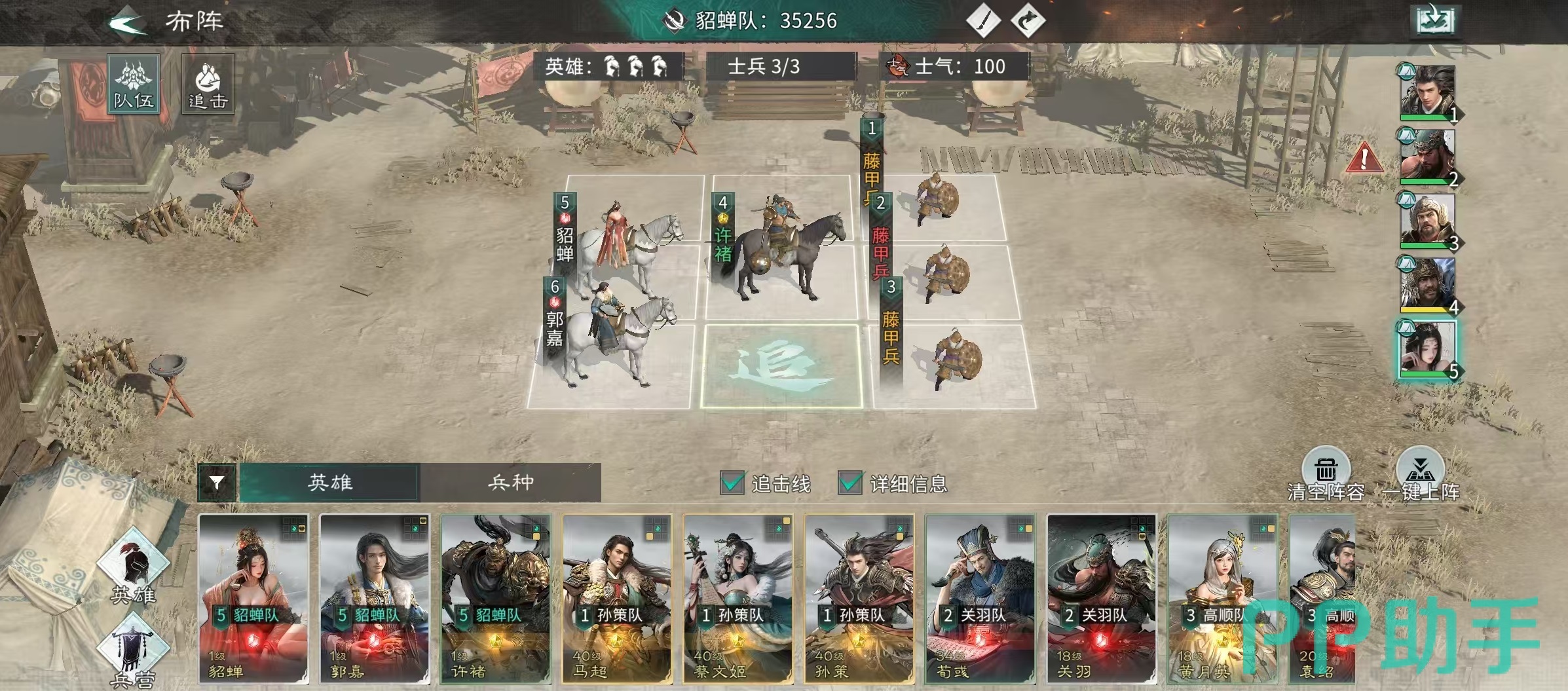 阵容布阵逻辑清晰:前排三格全部配置藤甲兵,集中承担伤害,保障后排武将生存空间;许褚置于中排核心位,确保技能命中率与输出环境;郭嘉与貂蝉分列左右,兼顾技能覆盖与协同响应。站位细节已在配图中标注,可直接参考部署。需注意,所有英雄需完成对应等级养成(含升星、技能解锁、天赋激活),方可完整触发点杀流机制效果。