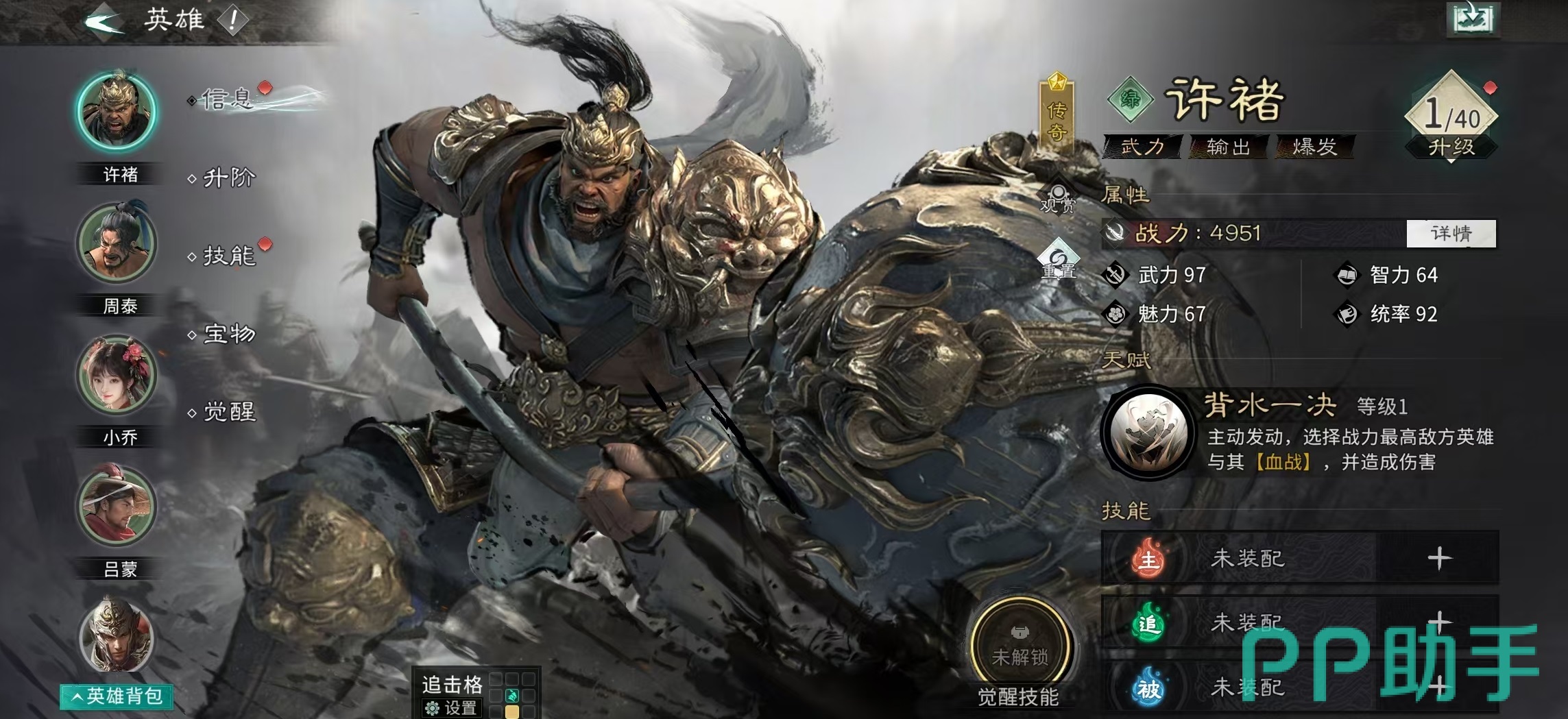 《三国天下归心》以高度自由的武将构建体系著称,每位武将均拥有专属天赋与觉醒机制,其余技能需玩家自主组合搭配,极大拓展了战术深度与实战多样性。本期攻略聚焦“许褚点杀流”阵容——以许褚为绝对核心,辅以郭嘉、貂蝉形成高效率单体斩杀体系,适用于PVP竞技场及高难度副本攻坚场景。