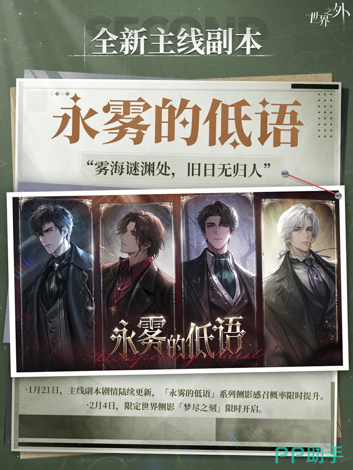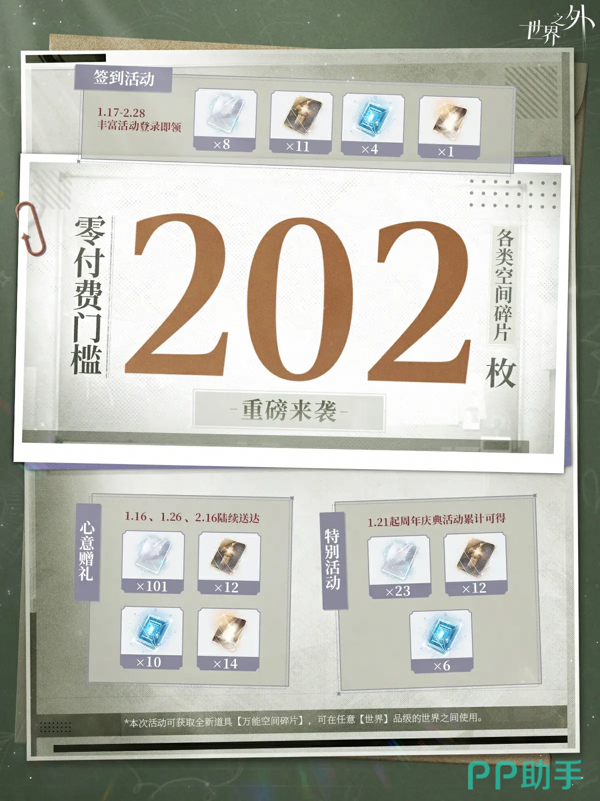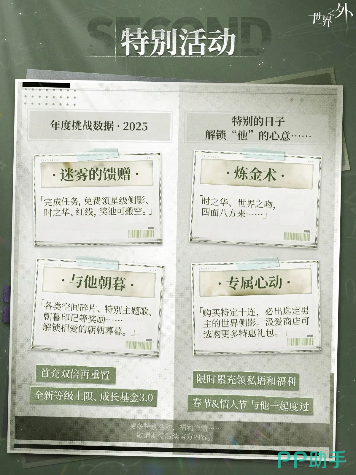 综上,《世界之外》二周年庆典以高质量内容更新与高密度福利投放为核心策略,既延续了无限流题材下的悬疑叙事张力,又在角色塑造、卡面设计、资源发放等多个层面强化玩家体验。无论是新入坑用户还是长期追随的老玩家,均可在本次活动中获得深度沉浸与切实收益。