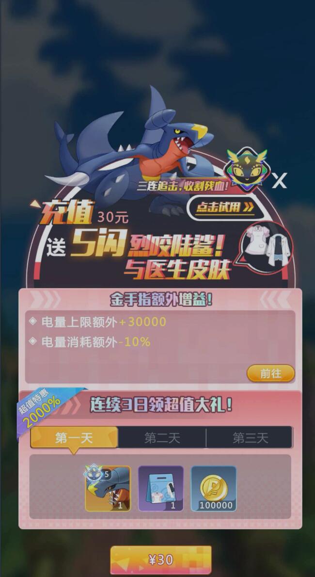 除首充外,30元充值档位亦具实用价值,侧重提供高频刚需养成资源,如金币、经验药水等,适用于多精灵同步培养阶段。此外,游戏内定期开放嘉年华活动,采用“充值+积分”双轨机制,玩家完成指定充值组合后可兑换限定精灵,例如超级暴鲤龙,其拥有高爆发输出与特殊机制,在PVE与PVP场景中均有突出表现。