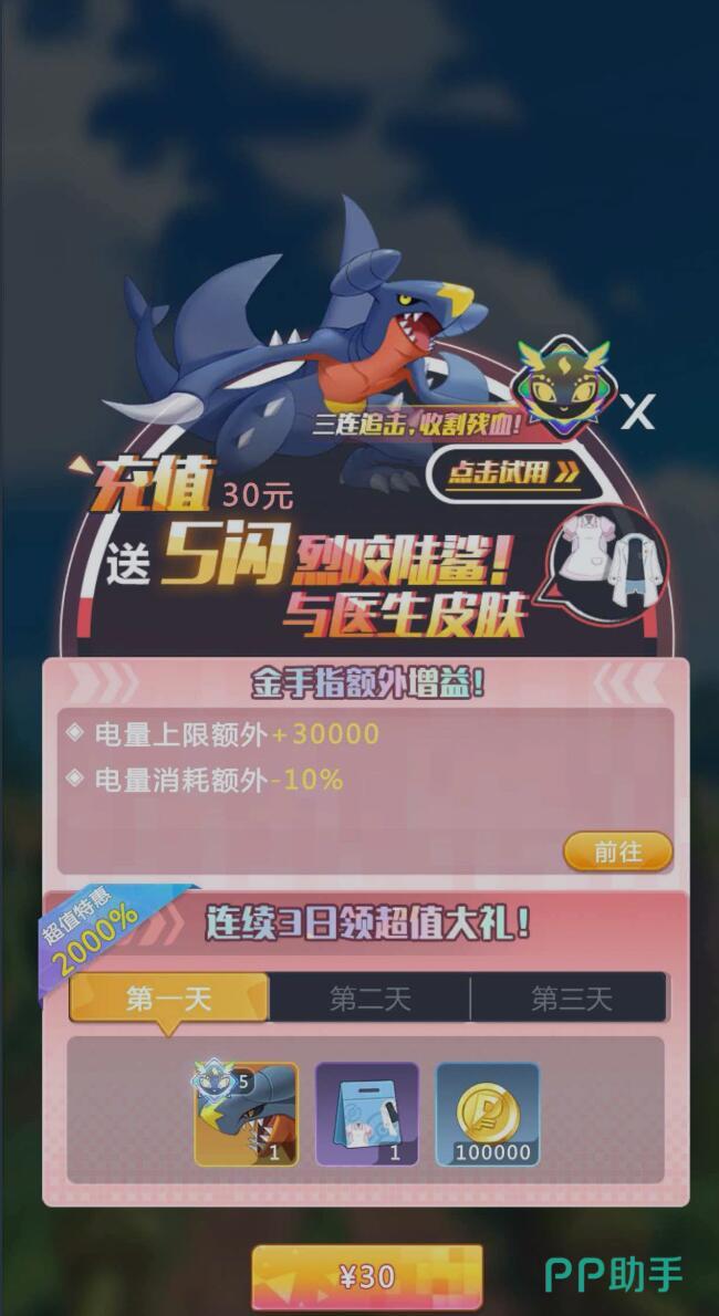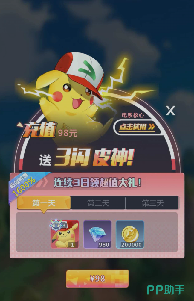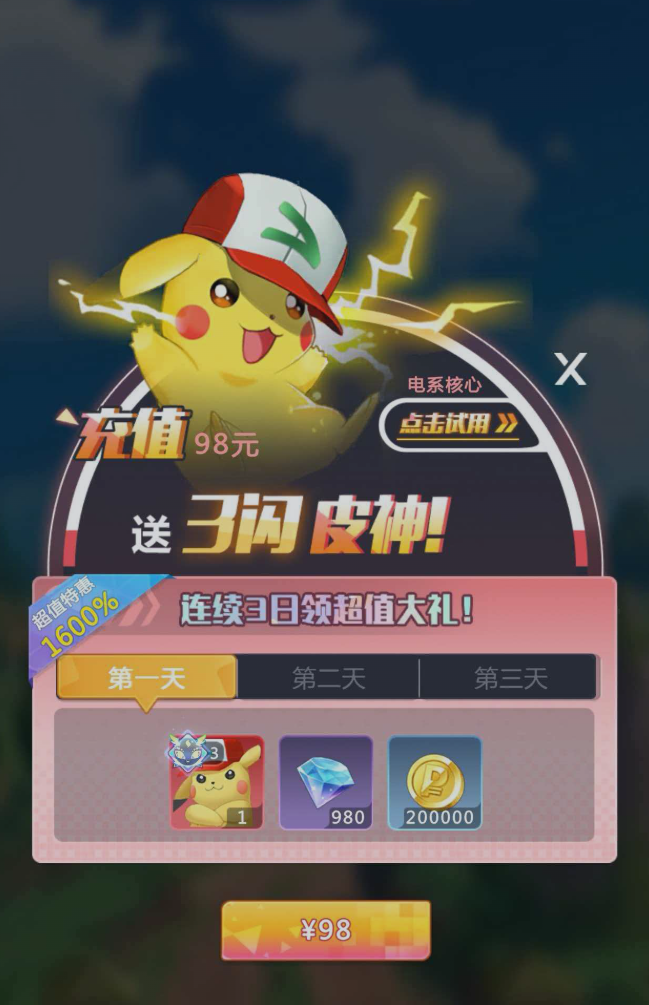 首充推荐选择98元档位,可直接获得闪光皮卡丘——该精灵具备独特外观与高基础属性加成;同时附赠大量钻石与金币,用于快速提升主力精灵等级、技能等级及装备强化进度。据实际测试数据反馈,该档位综合资源回报率约为16倍,能有效加速战力成型与阵容构建效率。
