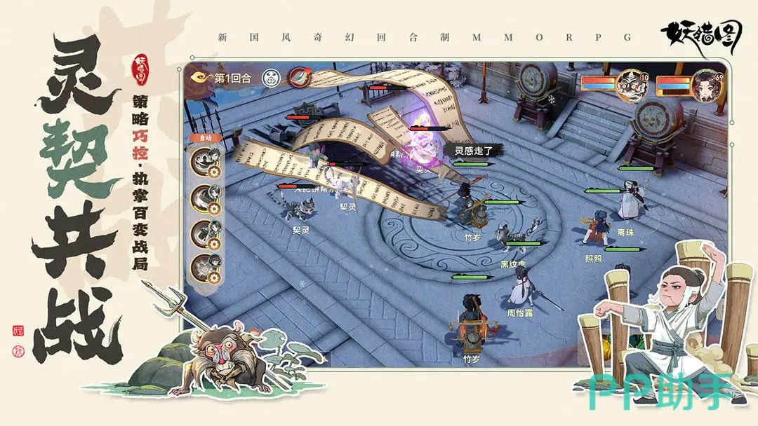 第二职业为「妖灵」,定位为中远程范围压制与属性干扰型输出。当前开放三位角色:卧云子、茹仙与参业。卧云子以笛音为媒介发动AOE伤害,并同步降低目标防御力,有效提升全队整体破防效率;茹仙使用铁环作为武器,具备高频率弹射打击能力,单次出手可连续命中多个敌人,输出节奏紧凑、覆盖率高;参业则依托双色佛珠构建复合输出体系——白珠主攻防御削减,黑珠专注暴击率与暴击伤害加成,二者协同释放可显著放大爆发上限。