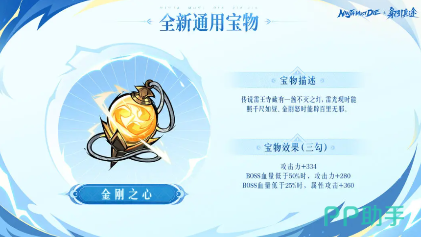 全新通用宝物【金刚之心】同步实装。该宝物设定源自雷王寺秘藏不灭之灯,基础属性为攻击力+334;当BOSS血量低于50%时,额外提升攻击力280点;血量低于25%时,进一步激活属性攻击+360效果。获取途径为“华光藏宝图”限时玩法。