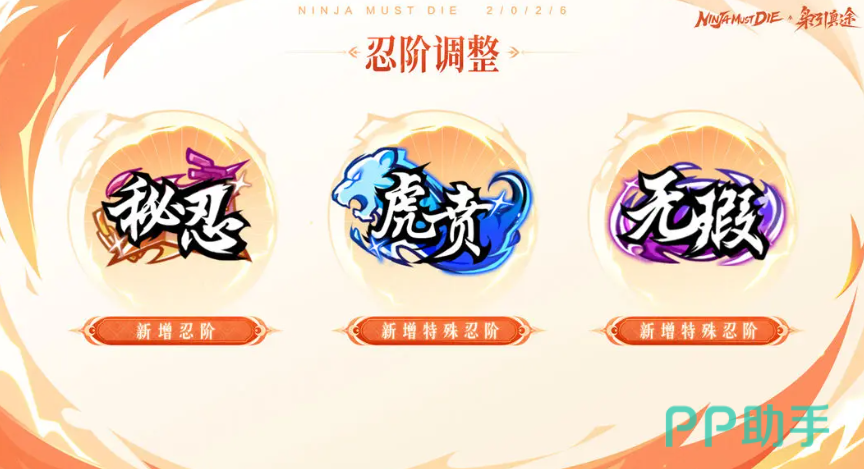忍阶系统迎来扩展,新增三大进阶层级:秘忍、虎贲、无瑕。其中秘忍为禁忍之后的最高段位,晋升可获金钥匙等稀有资源;虎贲为鹰扬角色专属进阶形态,需满足24名作战忍者命格均达6层方可解锁;无瑕为神行者进阶路线,通关220关故事模式且全程无伤即可激活。