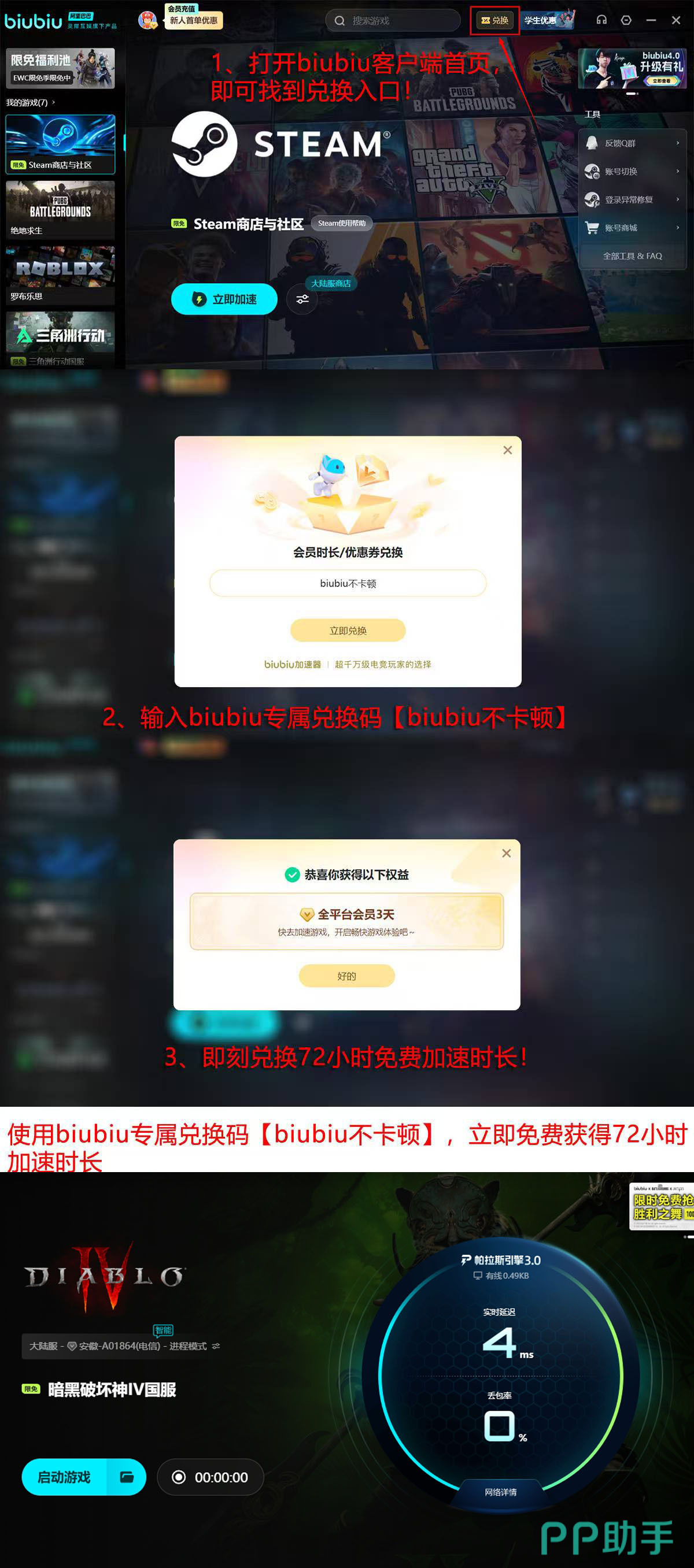 对于当前受网络困扰的《暗黑破坏神4》玩家,建议立即尝试:完成新用户注册后,系统将自动发放24小时加速时长;登录客户端后,在首页“兑换”入口输入口令【biubiu不卡顿】,即可额外获得72小时加速权益。两项福利可叠加使用,总计享96小时无限制加速体验。在遭遇副本闪退、技能延迟、地图加载失败等问题前,提前启用专业加速方案,是保障赛季进度、提升开荒效率与竞技公平性的关键一步。