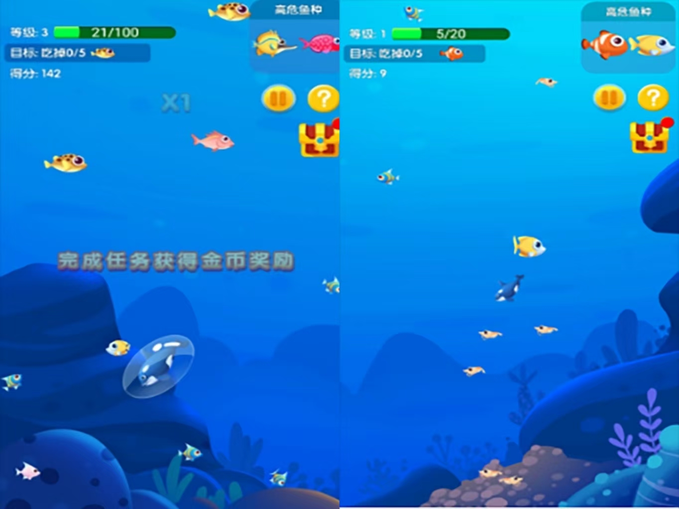 首先是《鱼吃鱼》和其他众多吃鱼类型游戏一样,它也是开始是以一条小鱼,作为玩家开始游玩。每吃一条小鱼,就会一点点的膨胀起来,看着自己的小鱼,一点点长大,心里的成就感也是特别的满足,而且升到一定等级之后,它还可以解锁技能,加速小鱼的成长,它的按键十分简单,用一根手指头就可以玩了,所以在无聊的时候,它也是一个消磨时间的利器。