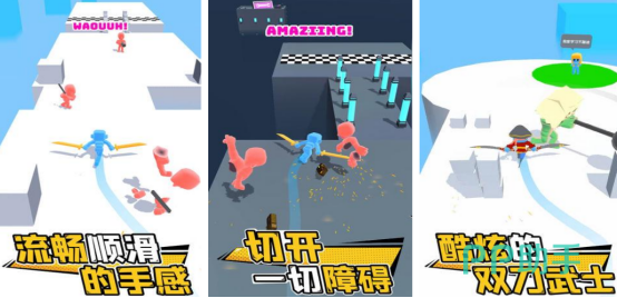 竖屏动作类游戏,主角为持双刀武士,穿梭于危机四伏的线性关卡。敌人与障碍密集出现,玩家通过拖拽屏幕实现自动挥斩,清除路径上所有对手并抵达终点即为成功。切割效果与操作幅度、持续时间强相关,另设商店系统,提供多款外观皮肤与时装供自由解锁。