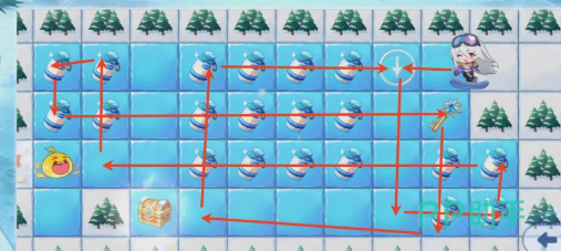 雪场活动是鲜牛奶与铃铛的重要来源,同时关联后续奖励解锁路径。其核心机制为“惯性滑行”:在无遮挡的冰面上,角色将持续滑动直至碰撞障碍(如树木)才停止。因此,路线预判比操作反应更为关键。初期关卡地形呈基础网格结构,推荐采用“右→下→左→上”的顺时针拾取顺序,可完整收集全部奶瓶并精准停驻终点,新手一次通过率极高。随着关卡推进,地图规模扩大但结构仍保持规整网格,此时应遵循“先右后左、由外向内”原则——优先清理右侧区域所有奶瓶,再开启宝箱,最后转向左侧区域,切忌直冲终点而遗漏关键道具。
