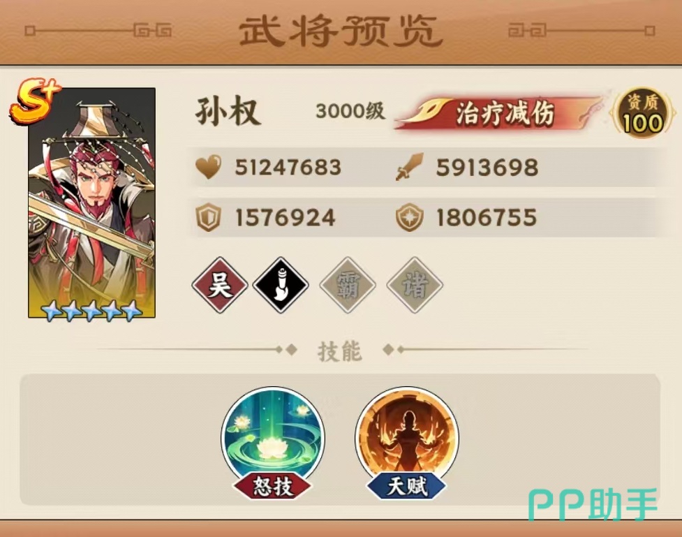 孙权当前评级为S+,基础资质为100,尚未达到满资质上限。虽在属性成长上限上略逊于满资质武将,但其双羁绊结构显著提升了阵容容错率与战术延展性——即“制霸江东”与“关东诸侯”两大核心羁绊。该特性使其在资源有限的新手阶段具备较高培养优先级,无需过度依赖高星突破即可发挥稳定作用。