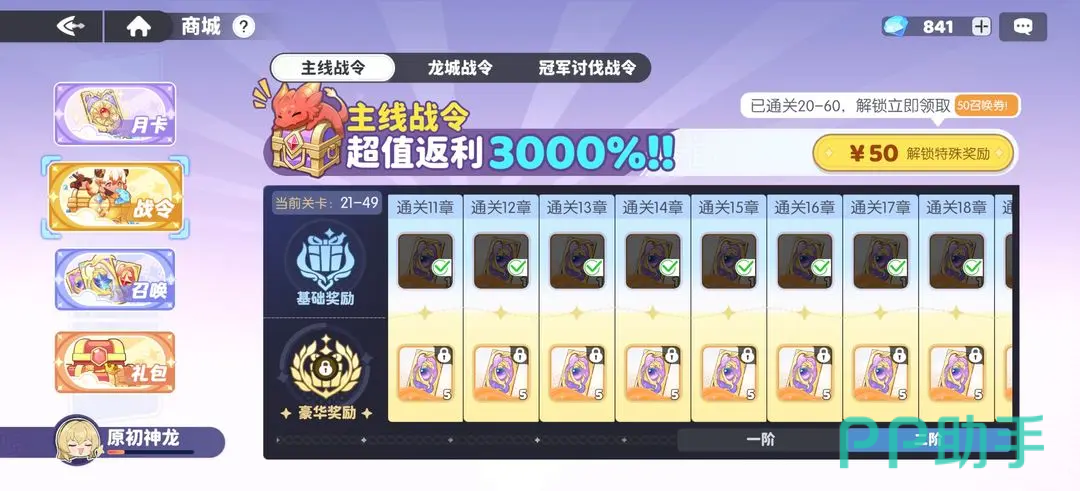 普通战令为性价比突出的周期性投入。除稳定钻石返还外,还包含实用的号角类道具(用于战力增幅)及通用抽卡资源,整体奖励结构均衡,资源转化链路清晰,是兼顾成长节奏与资源储备的理想选择。