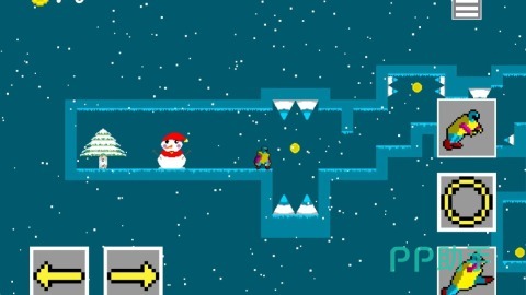游戏采用复古像素美术风格,构建出包含冰川、雪谷、冻湖等十余种差异化地形的冬季世界。关卡具备非线性路径设计,允许玩家自主选择行进路线。环境互动细节丰富,例如可破坏冰面、触发滑坡等动态机制,强化探索沉浸感与策略自由度。