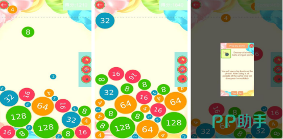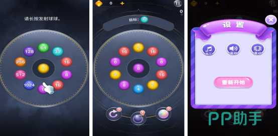 以弹射为核心交互方式,主界面中央固定一枚带数字标识的弹珠(如2或8),外围环绕多枚旋转数字弹珠。玩家需调整发射角度与力度,使中心弹珠准确撞击外围同数值弹珠完成合成。关卡目标具体明确,例如合成32或64。底部常驻三个功能道具,辅助应对复杂局面,降低通关门槛。