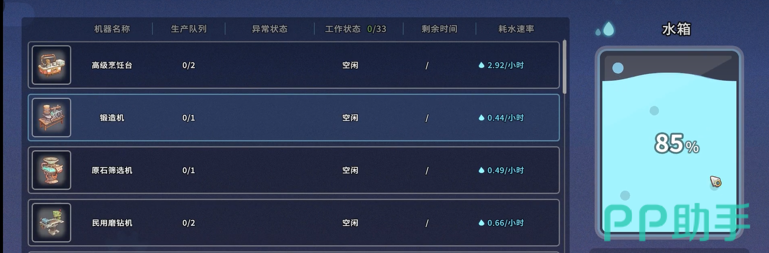 需特别注意水箱的容量阈值。基础型号最大储水量为20单位,界面右下角设有实时水位条。当水位低于30%时,即应启动补水流程;若降至0%,所有冷却型设备将强制离线,恢复运行需重新预热——此过程将额外消耗15秒等待时间。建立每2小时巡检一次水箱的习惯,可有效规避非计划性停产。