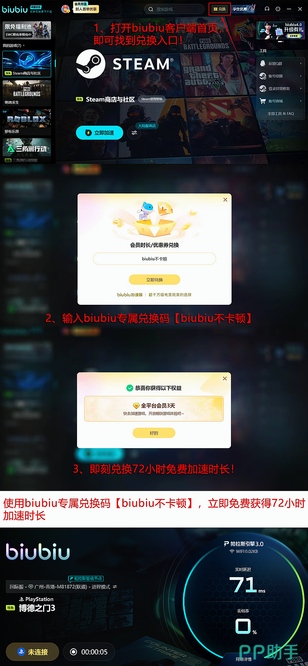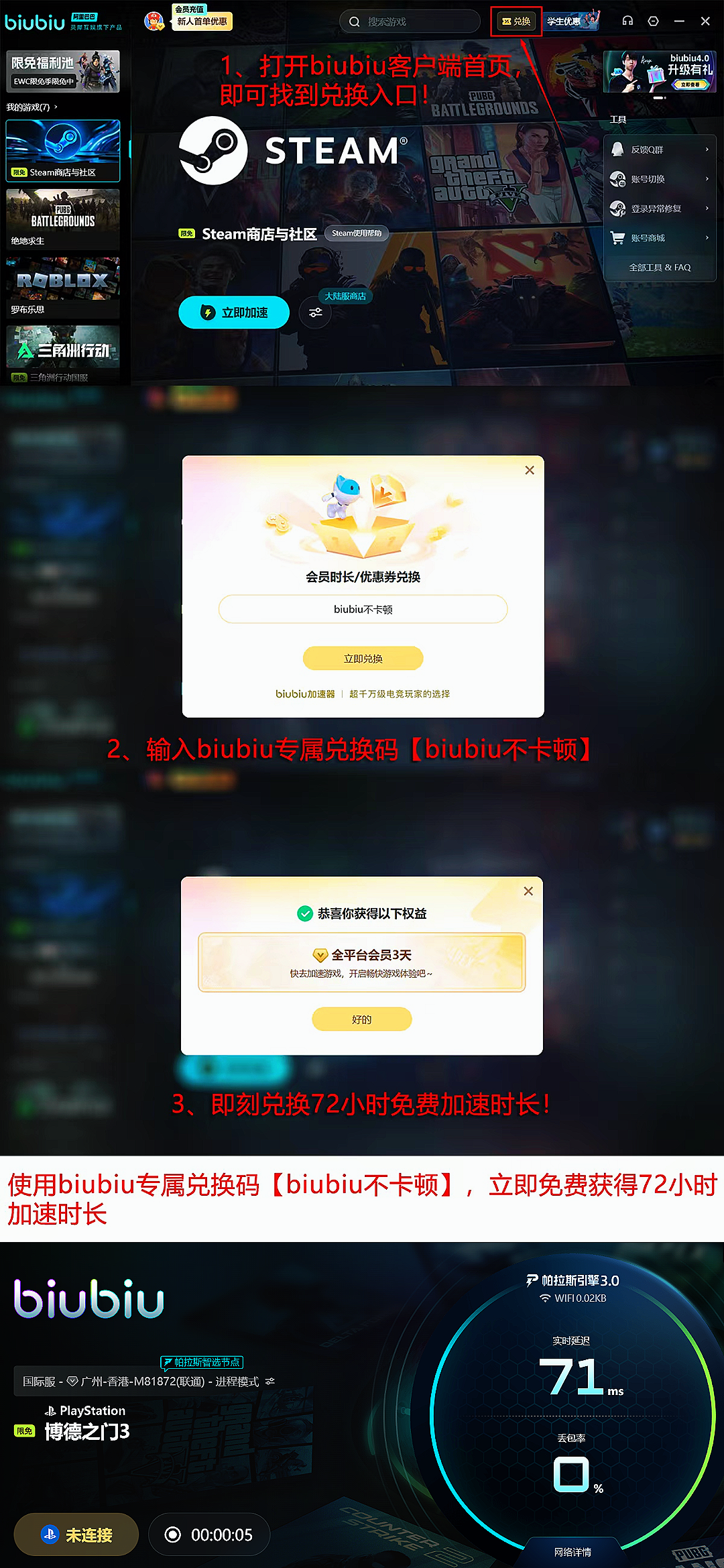 针对服务可靠性疑虑,用户无需额外担忧:新人完成注册就能直接解锁24 小时全场游戏免费加速特权,同时新老用户输入兑换码【biubiu 不卡顿】就能额外再领 3 天免费加速时长哦。