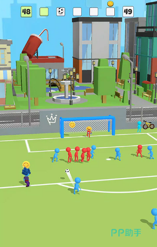 采用极简火柴人美术设定,场上角色仅通过球衣颜色区分阵营,外形统一。操作体系精炼:左侧虚拟摇杆控制移动方向,右侧双按键分别对应传球与射门,强调方向预判与按键时机的协同配合。球场采用高清大比例地图呈现,便于全局局势判断。提供手动操作与自动防守双模式——滑动持球角色即可触发射门动作,防守环节由系统智能完成拦截与抢断。