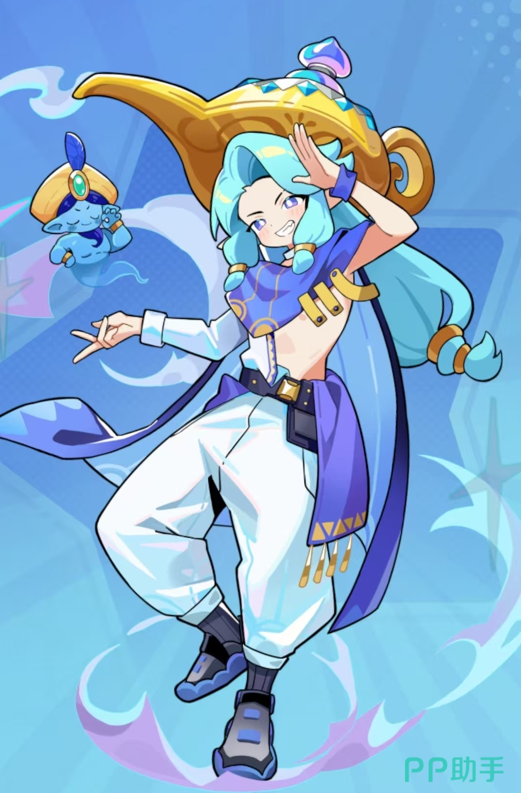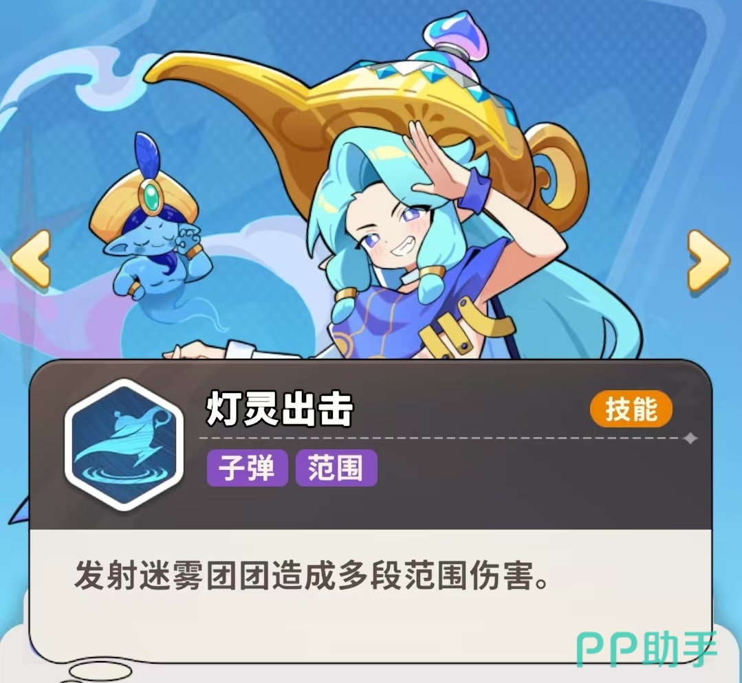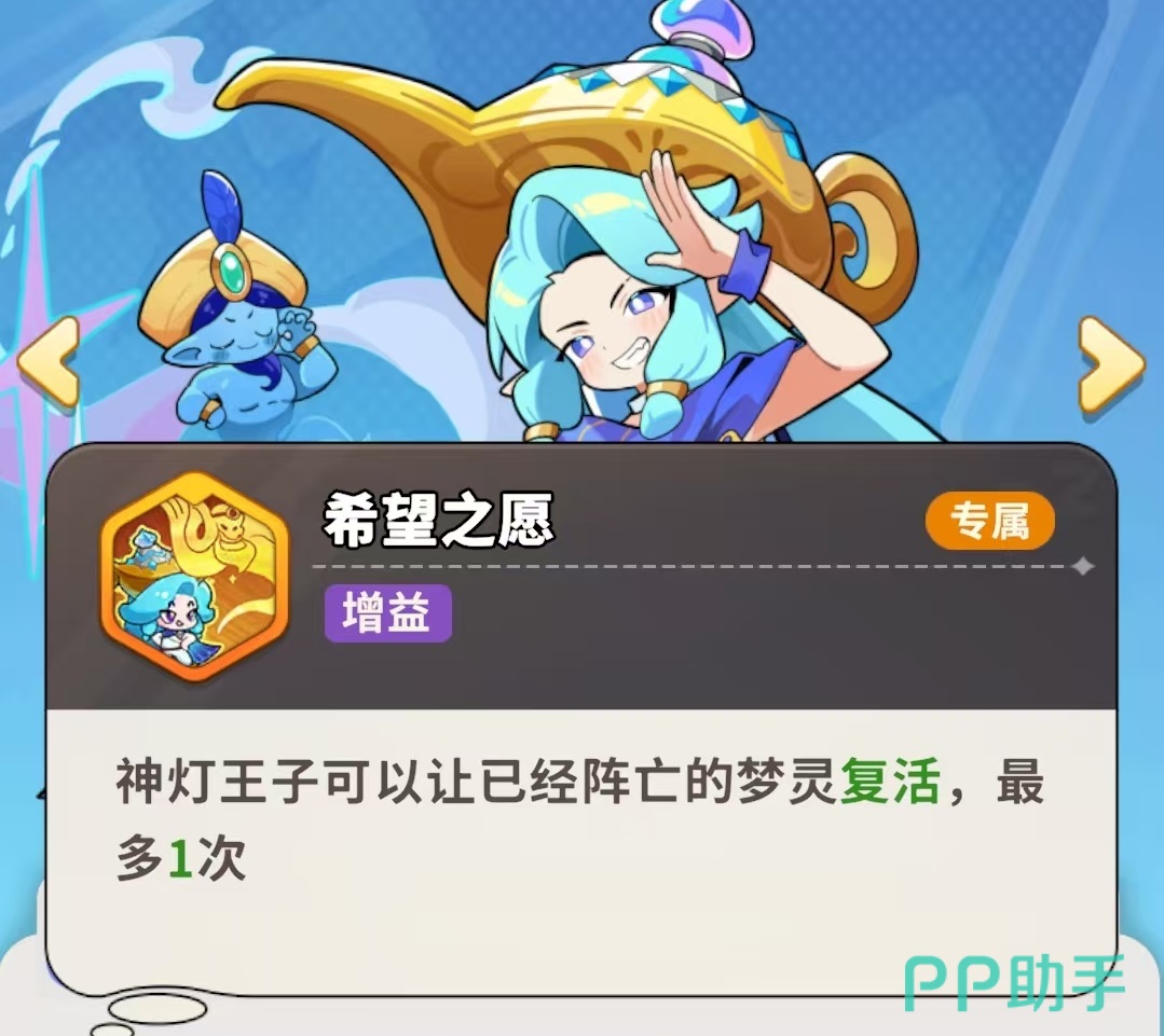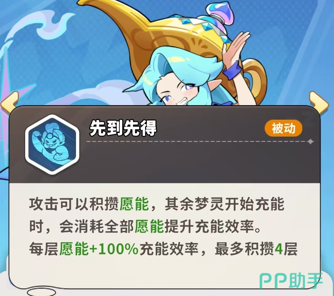主动技能“灯灵出击”可释放迷雾,对范围内敌人造成多段范围伤害;被动“先到先得”则构建其辅助枢纽作用:每次普攻积攒1层愿能(上限4层),当其他梦灵启动充能时,将自动消耗神灯王子当前全部愿能,每层提供100%充能效率加成,满层即达400%加速,显著压缩技能循环周期。