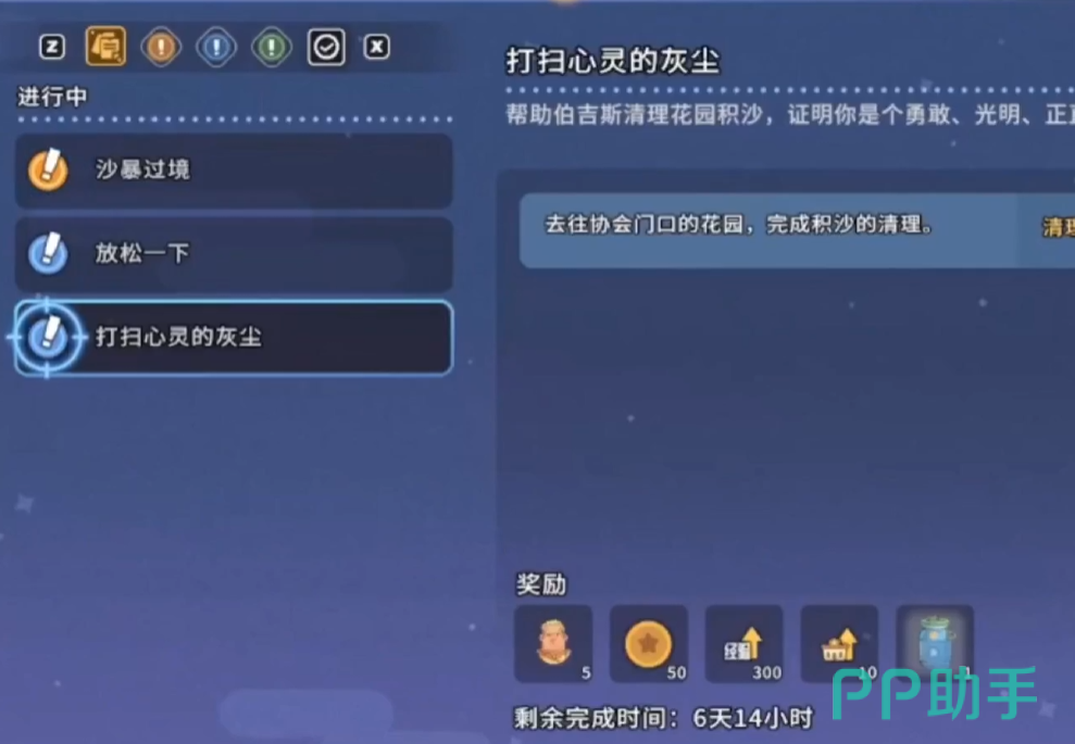 二是任务执行。商会每日刷新的日常委托中,常包含“清理花园沙堆”任务。该任务要求玩家前往指定庭院区域,对散落的沙粒进行清扫。触发任务后,系统将自动定位目标点位,玩家只需装备鸡毛掸子并连续执行清洁动作数次,即可完成沙堆清除,同步获得金币、经验值及协会贡献值奖励。